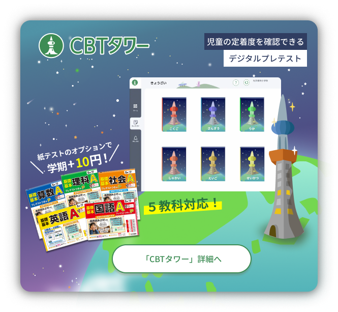 CBTタワーは、小単元ごとにたしかめができ、配信~集計までが先生の手間なく行えるデジタルテストです。